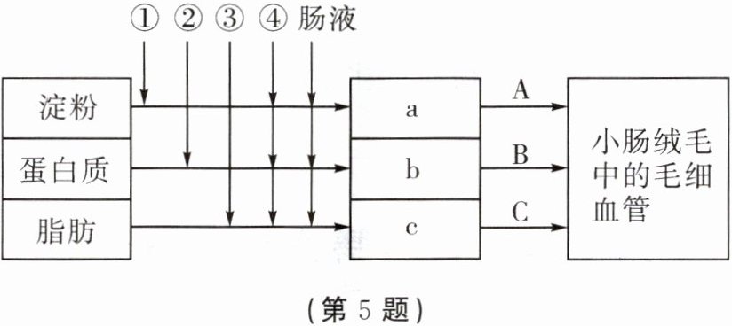 5. 下图表示人体内消化、吸收的过程。序号①~④表示消化液,纵向箭头表示消化液对相应营养物质的消化作用,字母a、b、c分别表示淀粉、蛋白质和脂肪的最终消化产物。请据图回答下列问题。