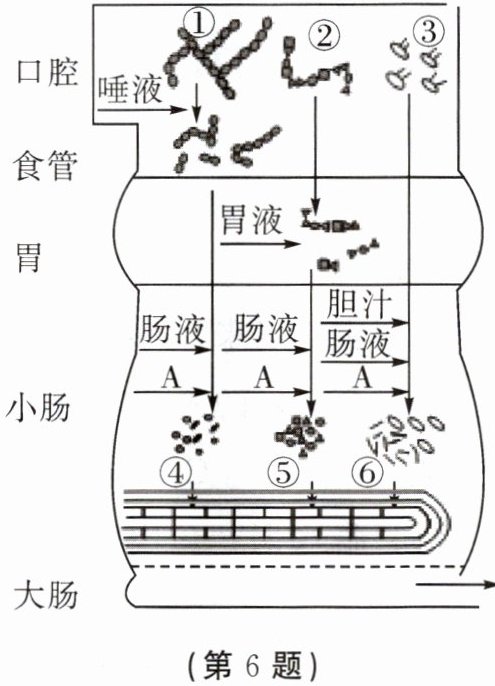 6. 下图是小亮整理的关于消化系统中部分营养物质在消化道各部位的消化程度,以及小肠结构图解笔记,请据图回答下列问题。