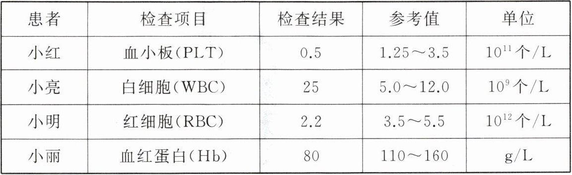 10. 下表是 4 名患者血常规化验的部分数据,请根据表中数据回答下列问题。