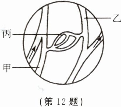 12. 根据图中血液流动的情况判断,甲、乙、丙三条血管各属于(