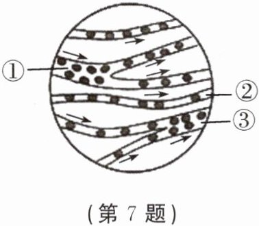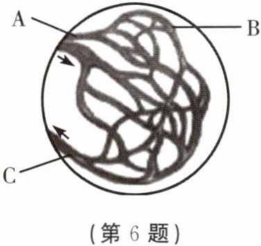 6. 下图表示明明在显微镜下观察到的小鱼尾鳍内一部分血管的分支情况,箭头代表血流方向,请回答下列问题。