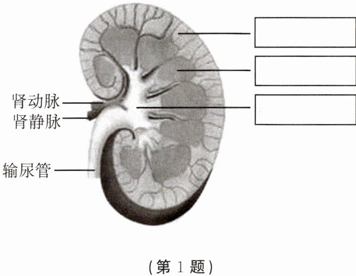 1. 结合肾脏的纵剖模式图,回答下列问题。
