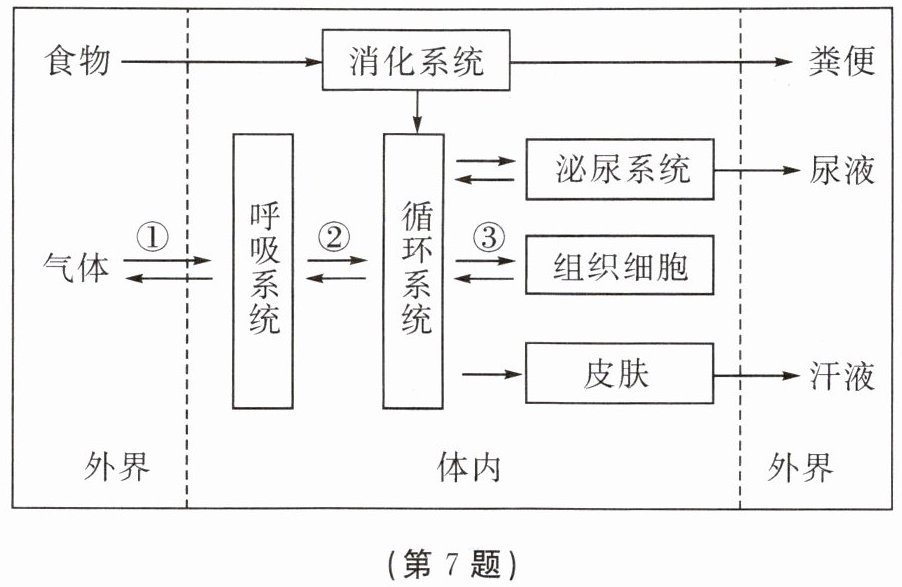 7. 人体维持正常生命活动,既需要从外界摄取食物补充物质和能量的消耗,又需要排出在代谢过程中产生的代谢废物(如二氧化碳、尿素等)。下图是维持人体正常生命活动时各系统相互协调配合的示意图,图中①~③表示生命过程。请回答下列问题。