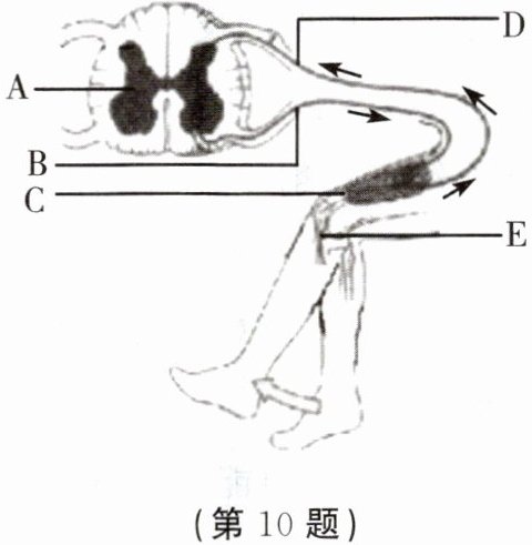 10. 膝跳反射是人体最基本的反射,在临床上常用于诊断患者的神经系统是否受损或患病。下图为该反射的示意图,请据图回答问题。