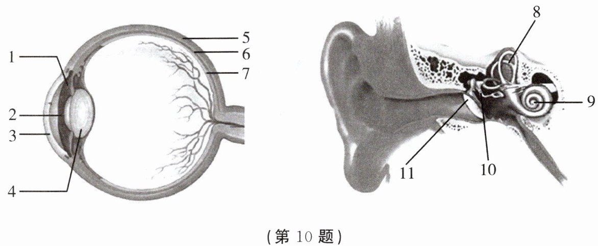 10. 下课铃响了,你匆匆地走出教室,进入食堂,看到了饭菜的颜色,闻到了饭菜的气味,尝到了饭菜的味道,手指感觉到了馒头的温热……请据图回答问题。