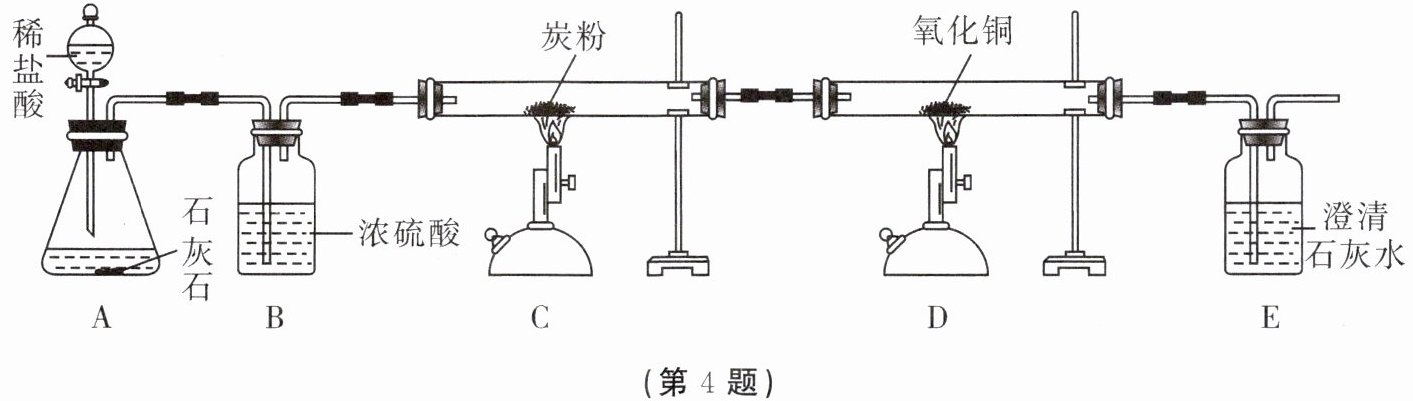 4. 如图是某课外学习小组设计的气体制备与性质验证的组合实验,其中装置 B 中的浓硫酸有吸水性,常用来干燥气体;装置 C 的作用是将二氧化碳和炭粉在高温下转化为一氧化碳。请看图回答下列问题: