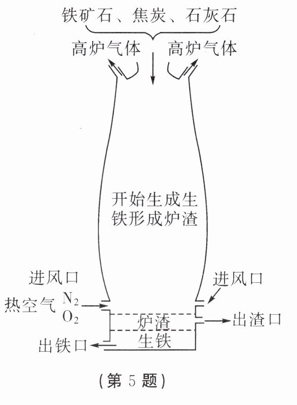 5. 如图所示是高炉炼铁时高炉内的化学变化过程。认真阅读有关信息,回答下列问题: