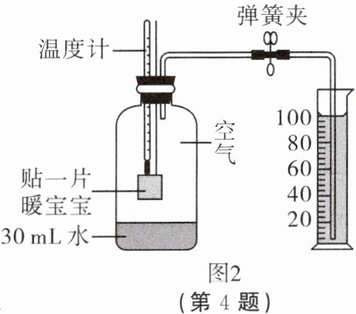利用暖宝宝的发热原理,小礼设计如图2实验装置来测定空气中氧气的含量。实验开始前,在容积为250mL的集气瓶中预装30mL水,量筒中水的读数为100mL。