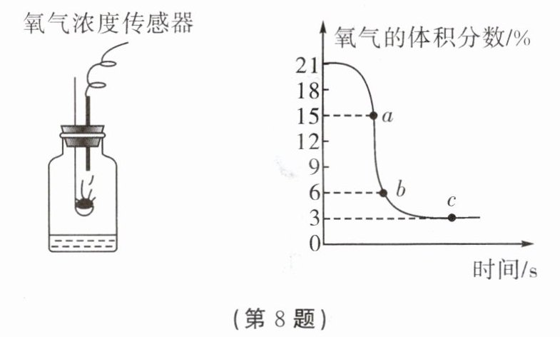 8. 某兴趣小组利用氧气传感器来检测足量红磷燃烧过程中氧气的含量,如图所示,下列判断正确的是 (