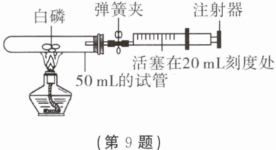 9. 某兴趣小组的同学选用如图装置,将白磷(与红磷作用相同)放入试管后,塞紧试管,并夹紧弹簧夹。燃烧结束后,等到试管冷却到室温后松开弹簧夹,观察现象。