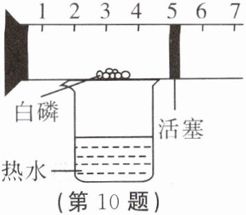 10. 科学贵在创新。如图,在一个有刻度和可以左右滑动的活塞的玻璃容器里放入过量白磷(白磷燃烧所需的最低温度为 $40^{\circ}C$),活塞左端管内密封有空气,右端的管口跟空气连通。将玻璃容器固定在盛有 $80^{\circ}C$ 热水(恒温)的烧杯上进行实验。试回答: