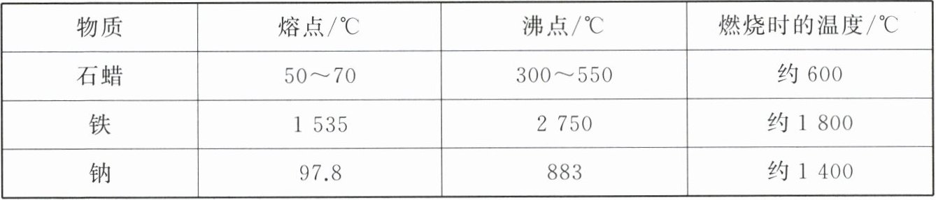 (填“熔点”或“沸点”)和燃烧时的温度有关。通过上表中石蜡、铁的数据对比,你认为物质燃烧时,什么情况下能产生火焰?沸点低于燃烧时的温度