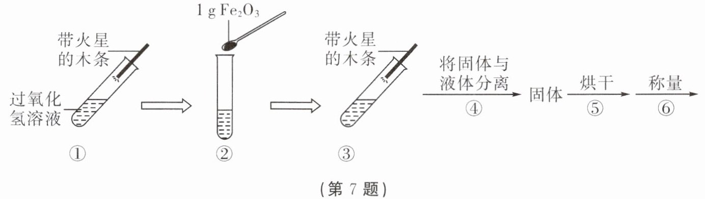 7. 同学们在学习了催化剂的知识后提出问题:氧化铁固体$(Fe_2O_3,$难溶于水),在过氧化氢制氧气的反应中能否起到类似二氧化锰的催化作用呢?