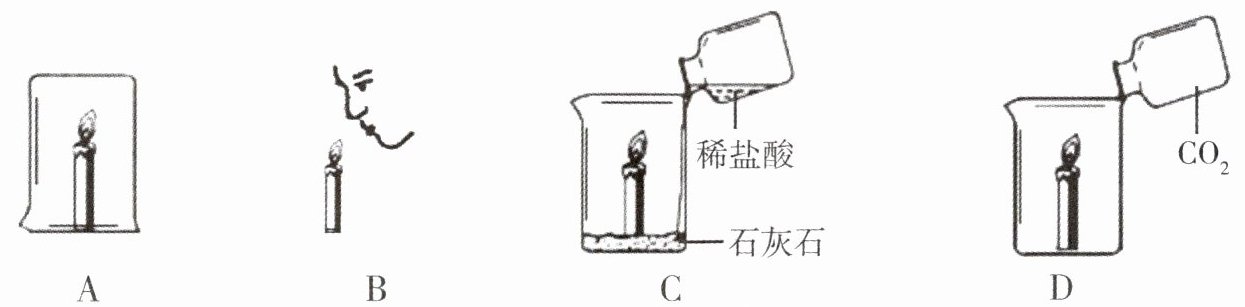 7. 下图中四支蜡烛都将熄灭,其中一支熄灭的原因与另外三支不同的是(
