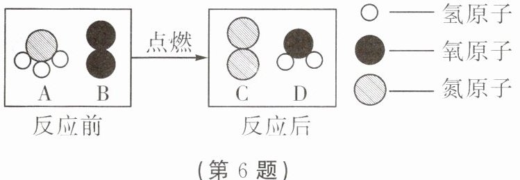 6. 在点燃条件下,$A$ 和 $B$ 反应生成 $C$ 和 $D$。反应前后分子种类变化的微观示意图如图所示。请回答下列问题: