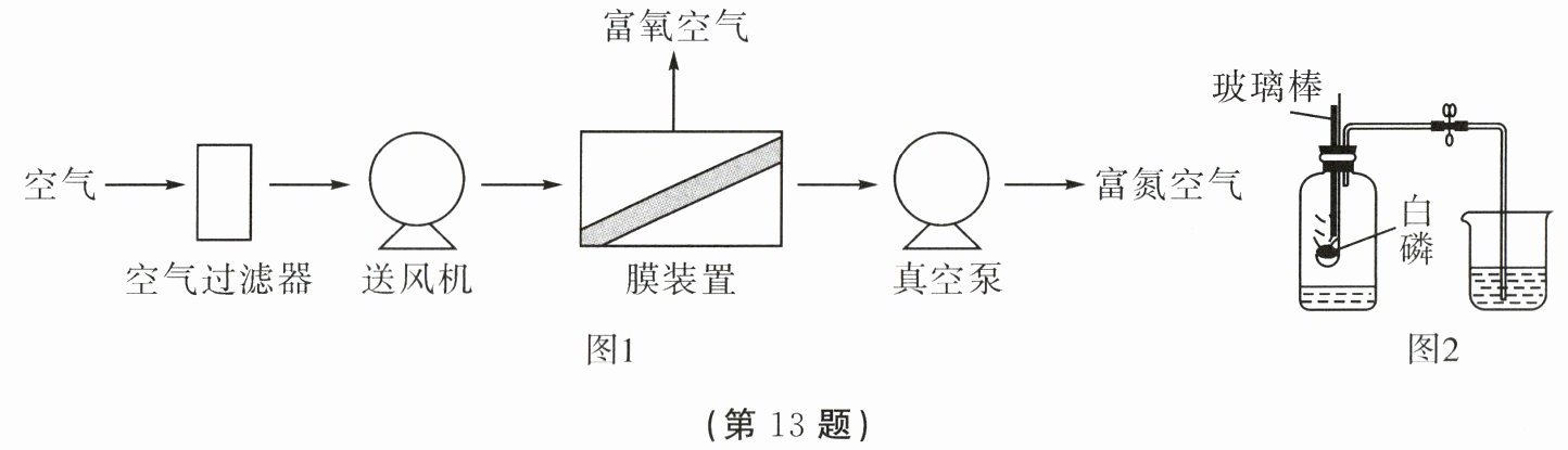 (4)图2是测定“人造空气”里氧气含量的实验装置。主要操作是:在实际容积为250 mL的集气瓶里,先装进50 mL的水,再按图连接好仪器,按下热的玻璃棒,白磷立即被点燃(白磷40℃即燃烧,燃烧产物与红磷相同)。冷却后,打开弹簧夹,最终集气瓶中的水为94 mL。该实验中白磷需稍过量,目的是