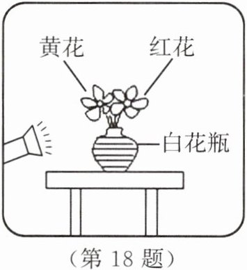 18. 阳光下的世界五彩缤纷,但大部分物体并不会发光。为什么能看到它们颜色的不同呢?小明进行了如下探究:如图所示,在不透光的房间里,摆放着一个插有两支花的花瓶,当用白光照射时,他看到白色的花瓶、红花和黄花;当用红光照射时,他看到红色的花瓶和红花,而原来的黄花变黑;当用黄光照射时,他看到黄色的花瓶和黄花,而原来的红花变黑。小明猜想:不透明物体的颜色是由它反射的色光决定的,白光是由各种色光混合而成的。