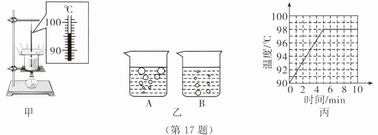 17. 图甲所示的是探究“水的沸腾”的实验装置。当水温上升到90℃时,每隔1min记录一次温度计的示数,直到水沸腾后5min停止记录。