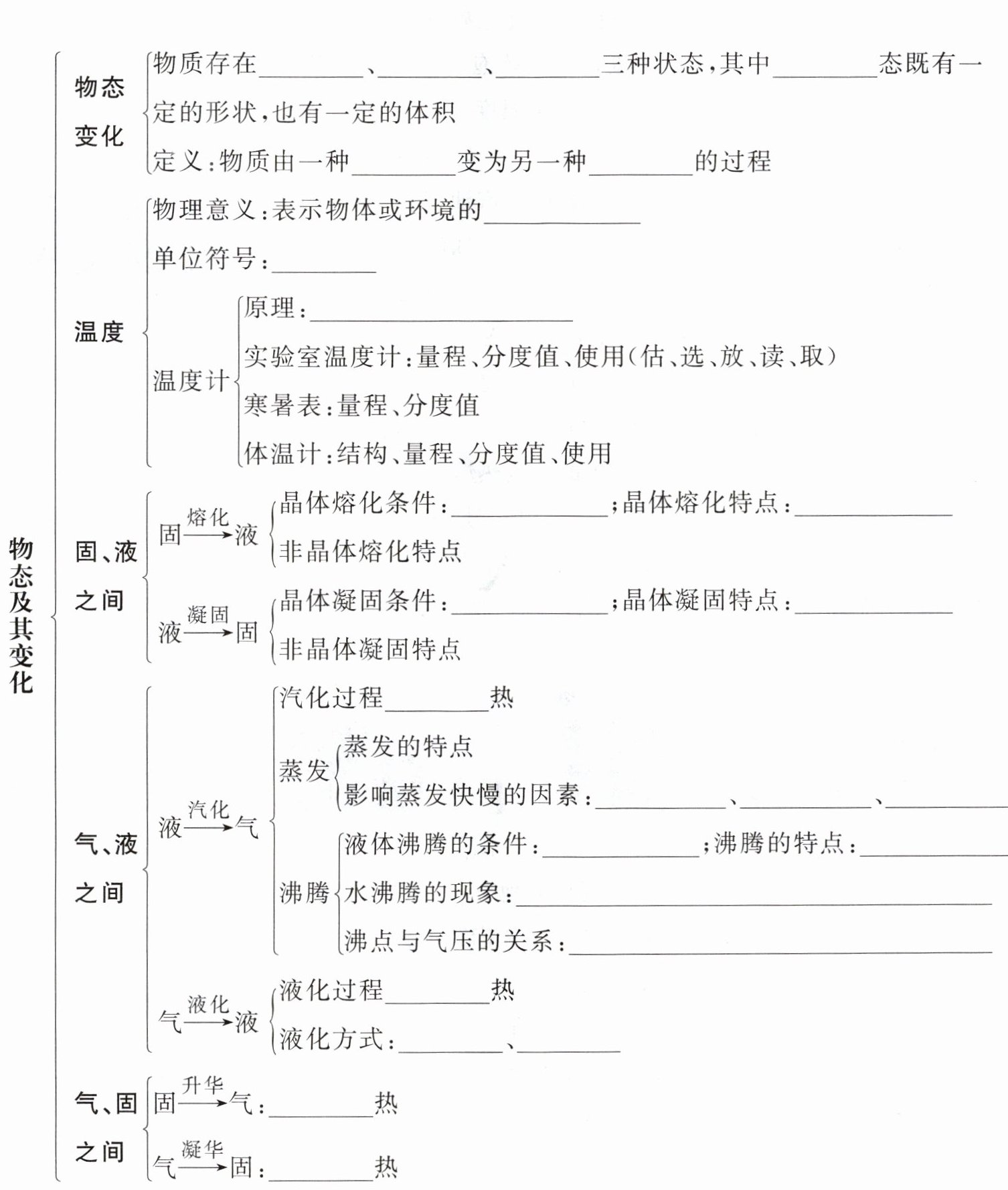 固态 液态 气态 固 状态 状态 冷热程度 $^{\circ}C$ 液体的热胀冷缩性质 达到熔点,继续吸热 吸热,温度保持不变 达到凝固点,继续放热 放热,温度保持不变 吸 液体的表面积 液体表面附近的空气流速 液体的温度 达到沸点,继续吸热 吸热,温度保持不变 形成的大量气泡不断上升、变大,到水面破裂 气压越大,沸点越高 放 降低温度 压缩体积 吸 放