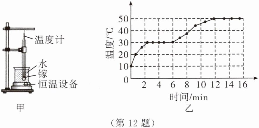 12. (多选)把温度为$10^{\circ}C$的固态镓放入图甲所示的装置中进行加热,水的恒定温度为$50^{\circ}C$,测得镓的温度随时间变化的情况如图乙所示,下列说法正确的是(