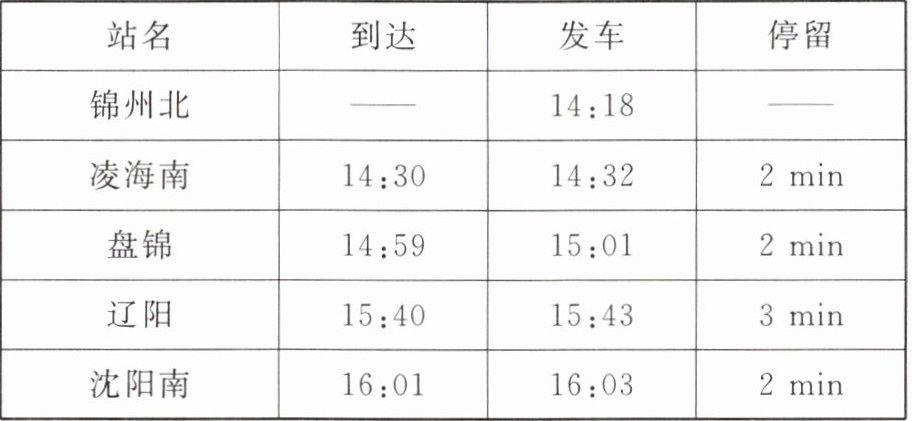 (2) 参考列车时刻表,如果列车从锦州北正点发车,但提前$3\ min$到达沈阳南站,全程的平均速度约为$150\ km/h$,则火车行驶的路程约为多少千米?