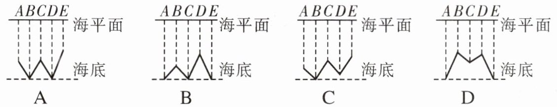 km。(设声波在海水中的传播速度为1500 m/s)(5) 一艘科考船行驶在某海域,并利用声呐系统对该海域的海底形状进行了测绘:在经过该海域水平面等间距的A、B、C、D、E五个位置时,向海底定向发射超声波,测得回收信号的时间分别为0.30 s、0.16 s、0.30 s、0.14 s、0.30 s。根据时间,求出海底与海平面的距离,就可以绘出海底的大致形状,则该海域海底的大致形状为
