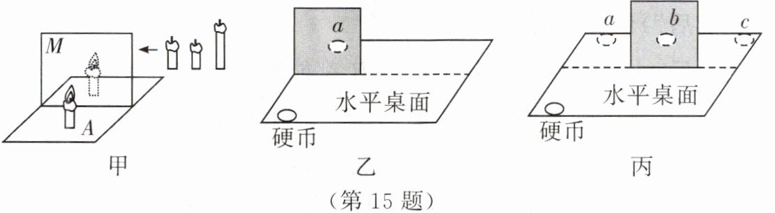 15. 为了探究平面镜成像的特点,小明同学准备了如下器材:粗细相同的各种长度的蜡烛若干、平面镜一块、玻璃板一块、白纸两张、硬币一枚、刻度尺一把等。