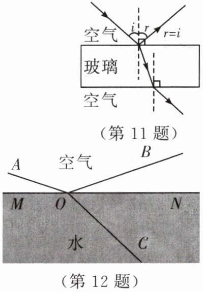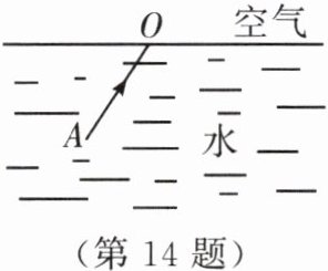 14. 如图,$ AO $为从水中斜射向水面的一束光,此时的折射角