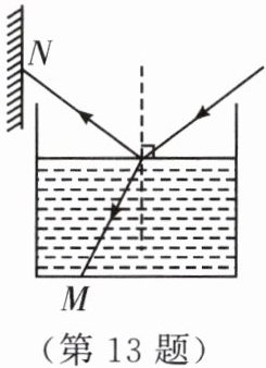 13. 如图所示,一束光经杯中的水面发生折射与反射现象后,在杯底$ M $点和墙面$ N $点形成两个光斑,保持入射光线位置不动,在缓慢往杯中加水的过程中,下列说法正确的是(