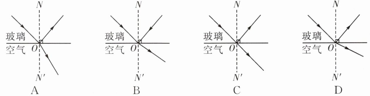 10. 光从玻璃斜射向空气中,在玻璃与空气的交界面上发生折射和反射,以下符合实际情况的是(