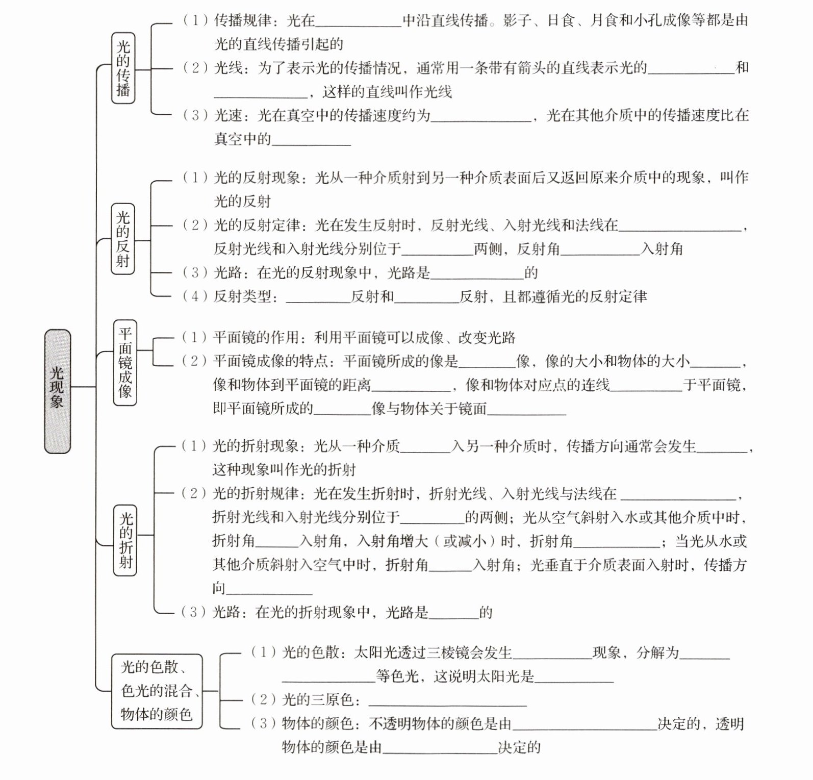 (1)传播规律:光在中沿直线传播。影子、日食、月食和小孔成像等都是由光的直线传播引起的