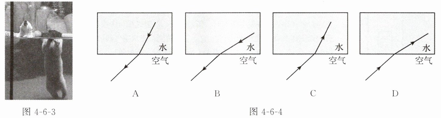 3. (江苏常州中考)海洋公园内,一头北极熊站在方形透明水族箱内,头在水面上,身体在水面下,水族箱外的游客居然看到了北极熊“身首异处”的奇异场景,如图4-6-3所示。此现象可以用图4-6-4中的哪个原理来解释?()