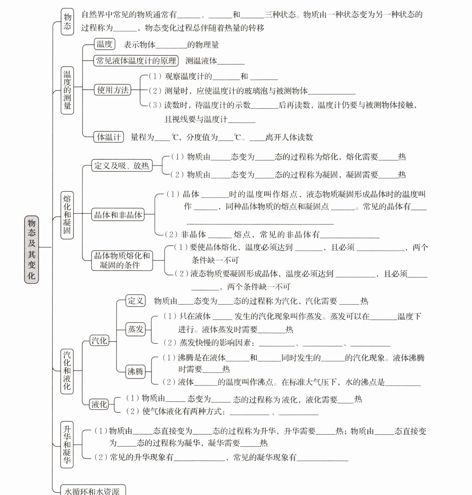 物态:自然界中常见的物质通常有、和____三种状态。物质由一种状态变为另一种状态的过程称为____,物态变化过程总伴随着热量的转移