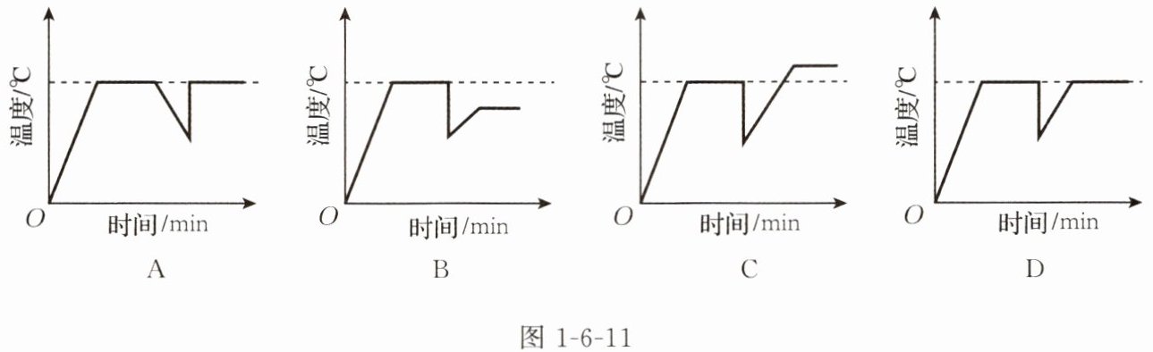(4)星期天小明在家烧水煮饺子,当水烧开、准备下饺子时,妈妈提醒他锅里的水有点儿少,于是小明又往锅里迅速加了一大碗水(水量比锅里的少),用同样大的火直至将水再次烧开。能说明其整个烧水过程中温度随时间变化的图像是图 1-6-11 中的