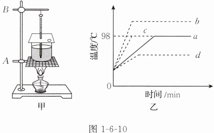 (3)小明根据实验数据绘制的水在沸腾前后温度随时间变化的图像如图 1-6-10 乙中的 a 所示。如果同组的小红减少烧杯中水的质量,水在沸腾前后温度随时间变化的图像可能是图 1-6-10 乙中的