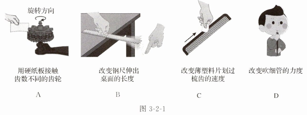 1. 为了探究音调与什么因素有关,小明设计了如图 3-2-1 所示的几个实验,则不能够达到探究目的的是(