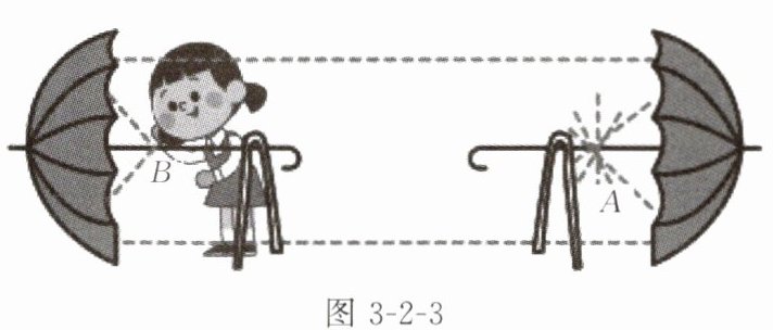 6. 如图 3-2-3 所示,学习了声现象知识后,爱思考的小雅在右边伞柄的 A 点挂一块机械手表,手表发出“滴答滴答”的声音,当她的耳朵位于 B 点时听不到声音。把另一把伞放在图示左边位置后,她在 B 点听到了手表的“滴答”声,这是因为伞增大了人听到声音的