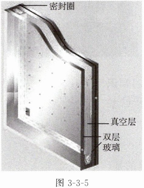 6. 随着人们对住宅功能要求的不断提高,门窗玻璃由普通单层玻璃改用双层真空玻璃,如图 3 - 3 - 5 所示,这种玻璃不影响采光,但却能起到减弱噪声的作用。从物理学的角度来看,噪声是指物体做