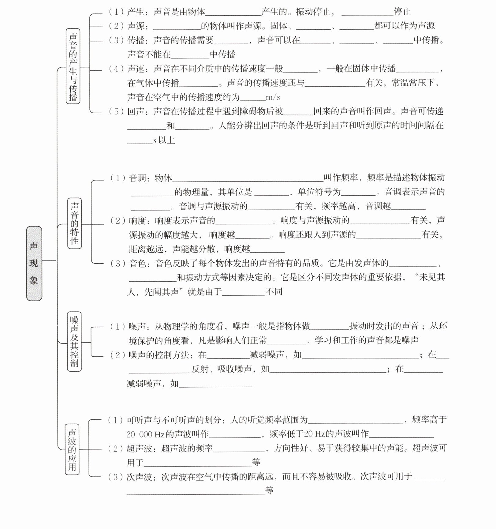 - (5)回声:声音在传播过程中遇到障碍物后被________回来的声音叫作回声。声音可传递和。人能分辨出回声的条件是听到回声和听到原声的时间间隔在________s以上