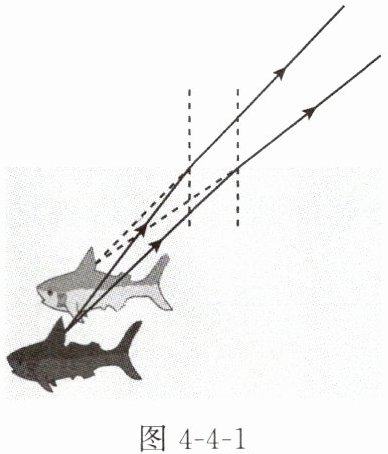 分析:鱼从水中斜射出的光线,由水进入空气中时发生折射,折射角大于入射角,折射光线进入人眼,人眼逆着折射光线的方向看,觉得光线好像是从它们的反向延长线的交点(即鱼的“像”的位置)发出来的,像的位置比鱼的实际位置高(如图 4 - 4 - 1 所示)。所以,在叉鱼时,要向看到的鱼的下方叉才可能叉到鱼。