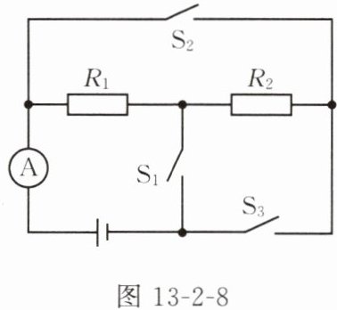 8. 如图13-2-8所示的电路中,电源电压恒定,定值电阻R₁=6Ω,R₂=24Ω。当开关S₁和S₂断开、开关S₃闭合时,电流表的示数为0.2A,则当开关S₁和S₂闭合、开关S₃断开时,电路中的总功率为