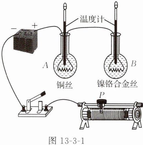 1. 小明利用如图 13 - 3 - 1 所示的装置探究“导体产生热量的多少与电阻大小的关系”,烧瓶中铜丝的电阻小于镍铬合金丝的电阻。