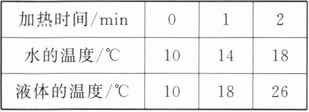 4. 用两个相同的电热器分别加热质量相同的水和某种液体,每隔 $ 1 min $ 记录一次数据,如下表所示。水的比热容是 $ 4.2×10^{3} J/(kg·℃) $,则该液体的比热容是(