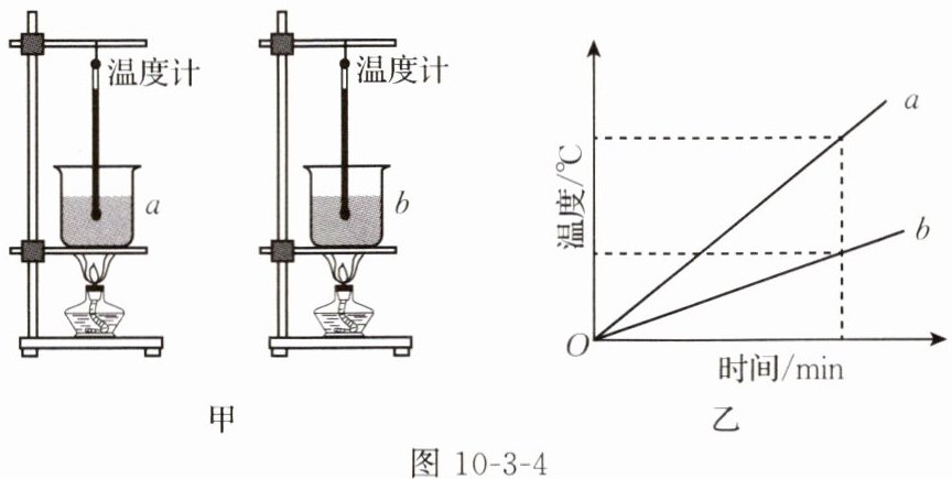 3. 用相同的装置分别对 $ a $、$ b $ 两液体加热(如图 10 - 3 - 4 甲所示),根据测得的数据绘制出这两液体的温度随加热时间变化的关系图像(如图 10 - 3 - 4 乙所示)。不计液体热量散失,分别用 $ m_{a} $、$ m_{b} $、$ c_{a} $、$ c_{b} $ 表示 $ a $、$ b $ 两液体的质量和比热容,则结合图中信息作出的下列推断正确的是(