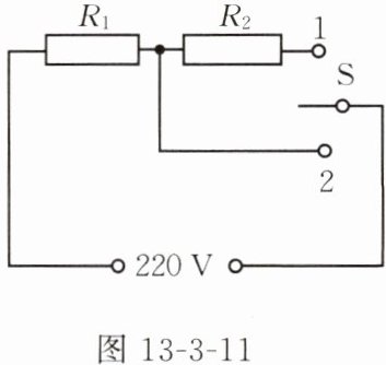 11. 现有一款具有高温、低温两挡的电热饭盒,其简化电路如图 13 - 3 - 11 所示,其中高温挡的电功率是 242 W,$ R_1 $、$ R_2 $ 均为发热电阻,且 $ R_2 $ 的阻值是 $ R_1 $ 的 4 倍。