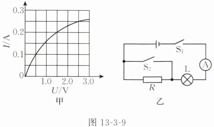 9. 小灯泡的 $ I - U $ 图像如图 13 - 3 - 9 甲所示,将它与定值电阻 R 接入如图 13 - 3 - 9 乙所示的电路中。只闭合开关 $ S_1 $,电流表的示数为 0.1 A;再闭合开关 $ S_2 $ 时,电流表的示数为 0.25 A,则可得:电源电压为