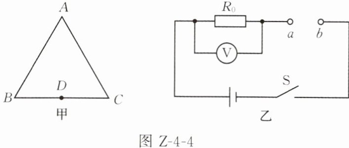 5. 图 Z-4-4 甲为用某电阻材料围成的边长为 12 cm 的等边三角形 ABC,D 为 BC 边的中点,该材料每 1 cm 的电阻为$1 \Omega$。图 Z-4-4 乙中电源电压恒为 U,$R_0$为定值电阻,a、b 两点为开放式接点。若将图 Z-4-4 甲中的 A、C 点分别接在图 Z-4-4 乙中的 a、b 两点(接 A、C 两点时三角形总电阻为$R_1$),电压表的示数$U_1 = 2 V$;若将图 Z-4-4 甲中的 A、D 点接在图 Z-4-4 乙中的 a、b 两点(接 A、D 两点时三角形总电阻为$R_2$),此时电压表的示数$U_2 = 1.8 V$。下列说法不正确的是(