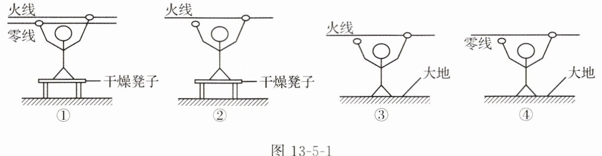 1. 如图 13 - 5 - 1 所示的哪些情况会发生触电事故?(