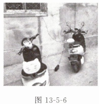 6. 如图 13 - 5 - 6 所示,有居民将电线插座从窗口悬挂至室外,给电瓶车充电。这种“飞线”充电方式存在安全隐患,是因为:①夜晚气温下降,空气中的水蒸气