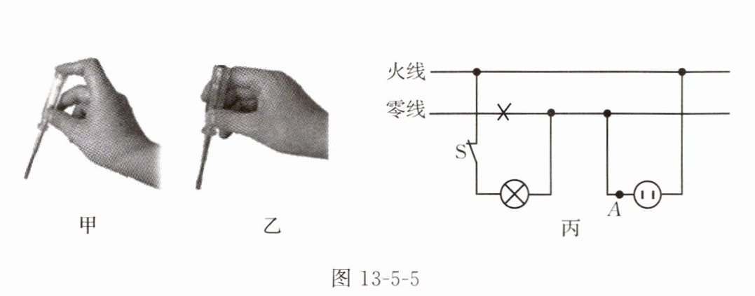(选填“甲”或“乙”)。小昊用试电笔检查家庭电路,如图 13 - 5 - 5 丙所示,电路中画“×”处表示该处断路,开关 S 闭合后,用试电笔测试电路中的 A 点,试电笔的氖管会